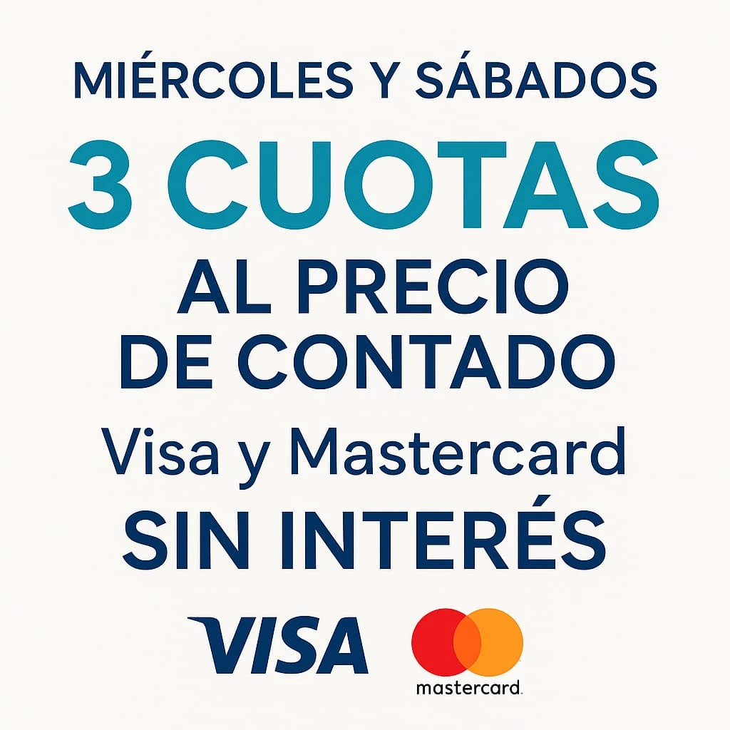 Precio contado incluye: Efectivo, Débito, Crédito en 1 pago y 3 Cuotas con Visa y Mastercard los días Miércoles y Sábados